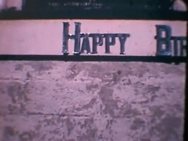 A vintage 8mm film clip showing a 'Happy Birthday' sign on a textured wall.