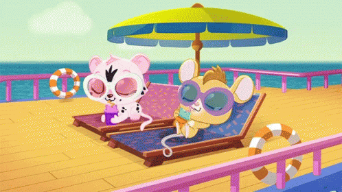 Littlest Pet Shop characters, a dalmatian and a mouse, toast drinks on a sunny beach.