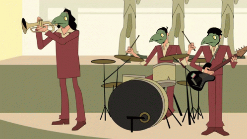 The animated band Taburete performs live, with members playing instruments while wearing unique bird-like masks.