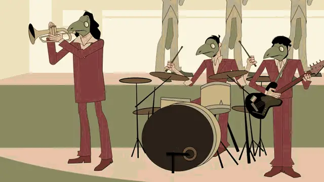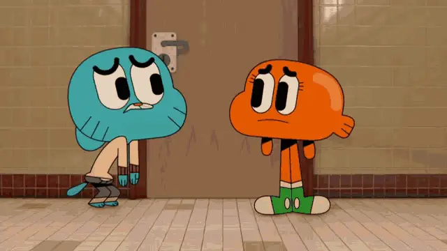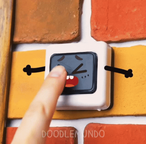 A finger presses an animated button on a brick wall, causing its cartoon face to react with various emotions.