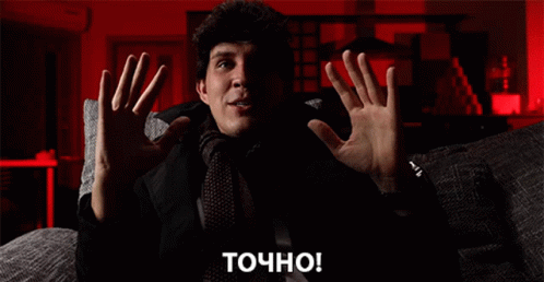 Russian influencer Дима Масленников exclaims 'Exactly!' with hands raised, sitting on a couch in a red-lit room.