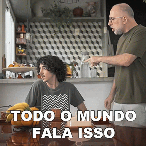 Antonio Tabet in a scene where a man points at him, with the Portuguese phrase 'Todo O Mundo Fala Isso' displayed.
