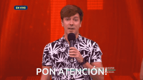 Roger Gonzalez, from Todos Quieren Fama, holds a microphone and says 'Pon Atención!' to the audience.