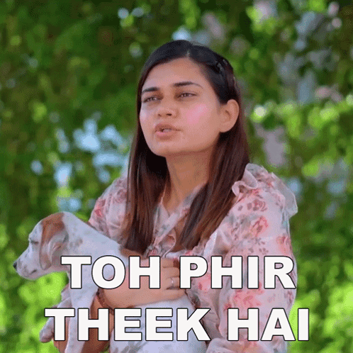 Nancy holding a cute dog, saying 'Toh Phir Theek Hai' (Okay then) with a green outdoor background.