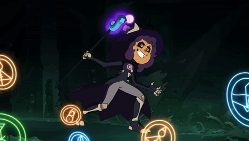 Luz Noceda from The Owl House casting a spell with her staff in a dark forest.
