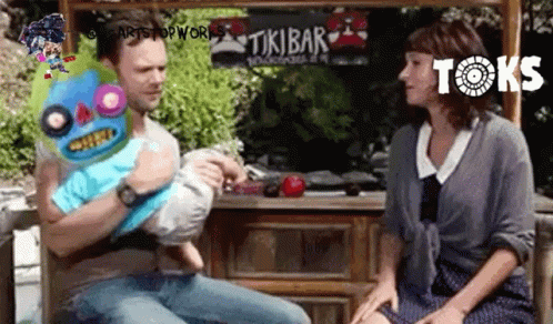 A man playfully interacts with a baby wearing a unique zombie-themed toy head, showcasing the Baby Toks NFT.