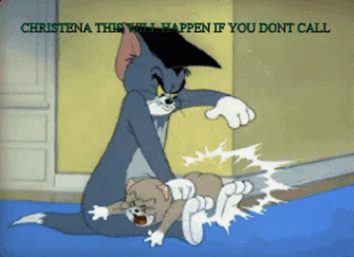 Tom slaps Jerry's bottom in a classic cartoon clip, accompanied by the caption 'CHRISTINA THIS WILL HAPPEN IF YOU DON'T CALL'.