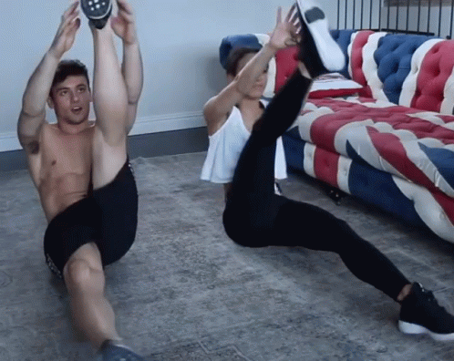 Tom Daley and a woman perform intense abs exercises, including crunches and V-ups, on the floor.