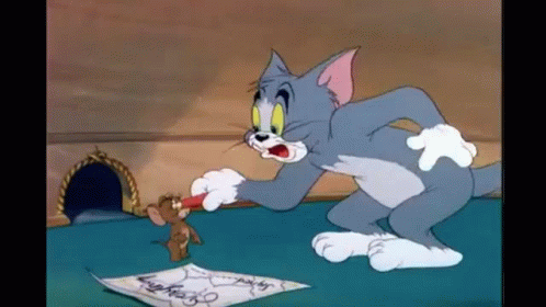 Tom and Jerry: Tom pleads on his knees as Jerry stands over a drawing with a pencil.