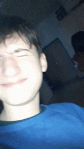 Tomáš Němeček Tomeš makes a funny face and laughs, wearing a blue shirt in dim light.