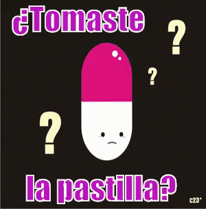 A cartoon pill with a sad face asks in Spanish, 'Did you take the pill?' surrounded by question marks.