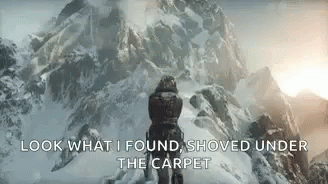 Lara Croft, the Tomb Raider, embarks on a challenging snowy mountain climb, with a meme caption.