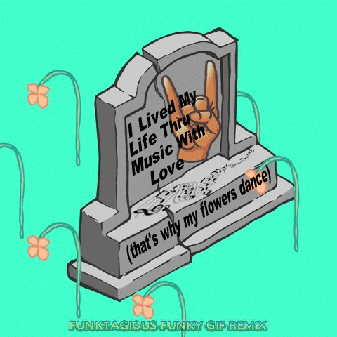 An animated funky tombstone with the inscription 'I Lived My Life Thru Music With Love' and dancing flowers.