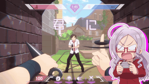a video game screen shows a girl holding a controller and a man holding a knife with 1:45 on the screen