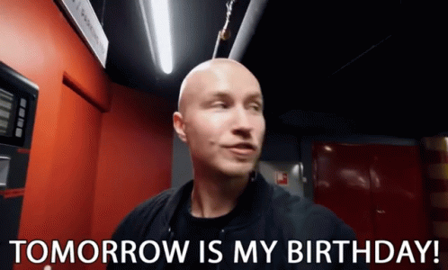 Rudi Rok excitedly announces that tomorrow is his birthday, looking directly at the camera.