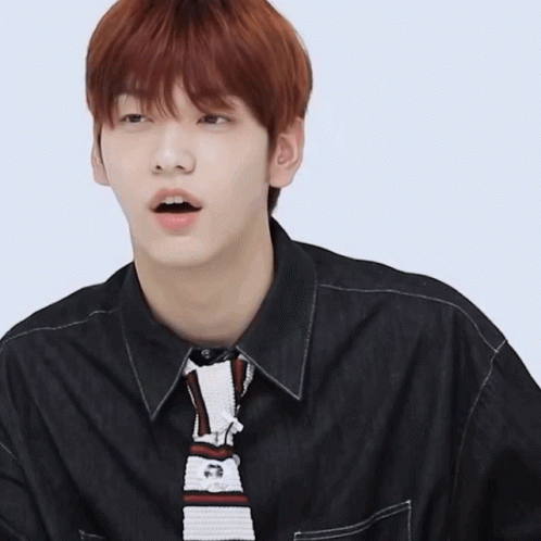 TXT's Soobin with red hair, looking confused and baffled, wearing a black shirt and striped tie.
