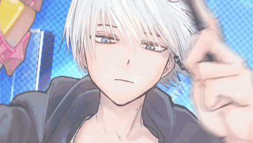 a close up of a person 's face with white hair and blue eyes