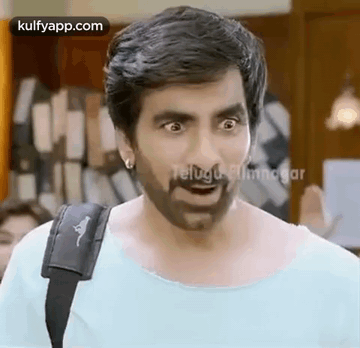 Ravi Teja makes a surprised face with his tongue slightly out, wearing a light blue shirt and carrying a backpack.