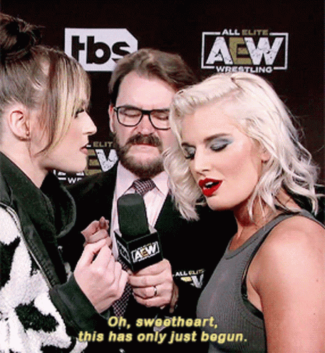 Toni Storm confronts another wrestler during an interview, declaring, 'Oh, sweetheart, this has only just begun.'