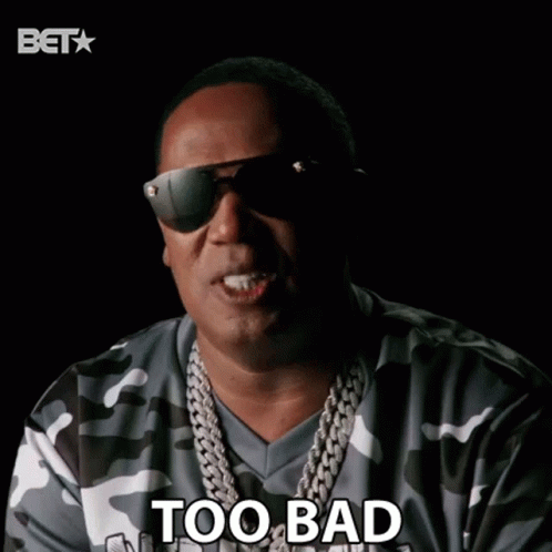 Master P, wearing sunglasses and a camo shirt, delivers the phrase 'Too Bad' on BET.