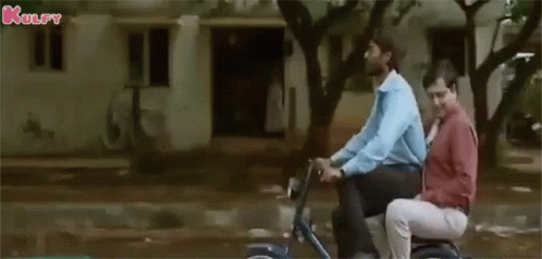 Dhanush and Vivek riding a very slow bike in a scene from Velai Illa Pattadhaari.