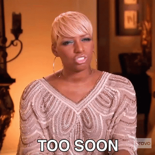 Nene Leakes of Real Housewives of Atlanta reacts with a 'Too Soon' expression in a sparkling top.