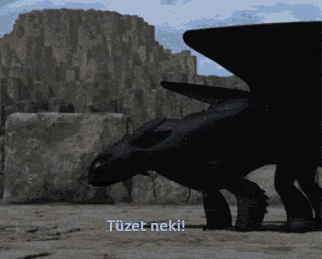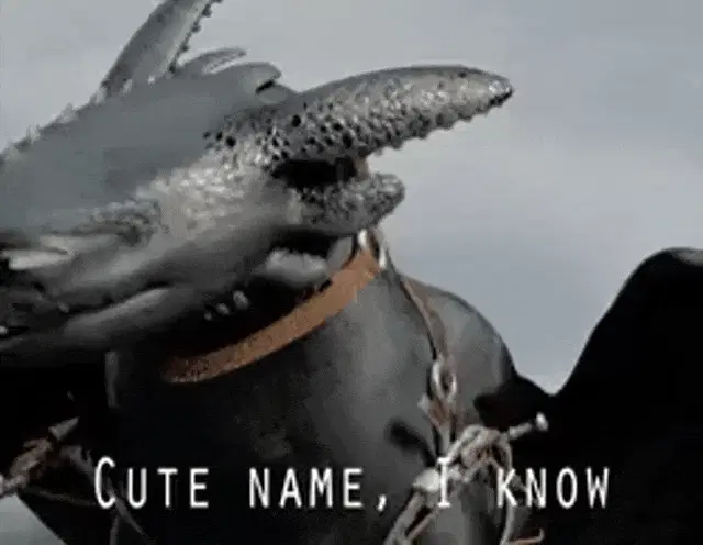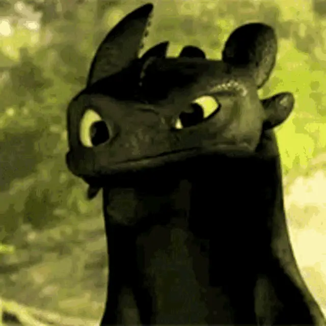 An adorable animated drawing of Toothless, the black dragon, smiling and holding a red object.