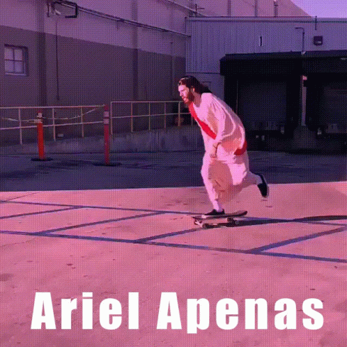 Ariel from Torcida Jovem, dressed as Jesus, performs a skateboard trick over a ledge in a parking lot.