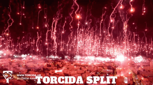Spectacular red fireworks light up the night sky over Split, celebrating Torcida Split.