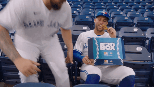 a blue jays player is holding a batter 's box while eating a chicken nugget