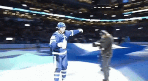 Toronto Maple Leafs star Mitch Marner shares a heartwarming hug with mascot Carlton The Bear on the ice.