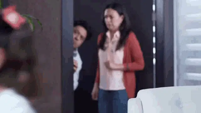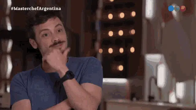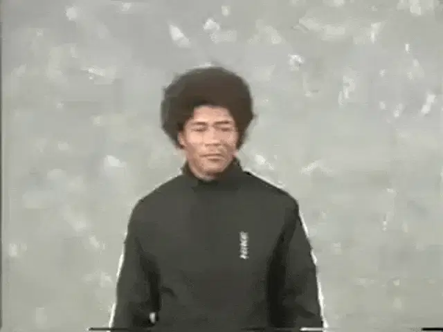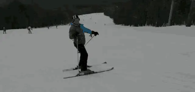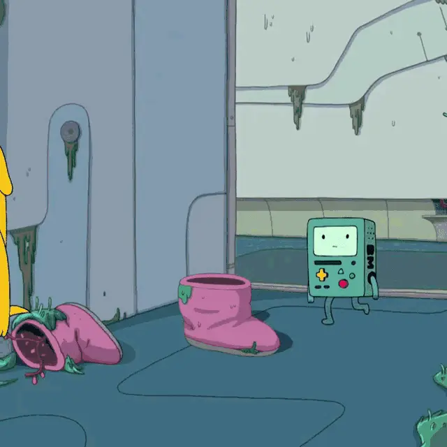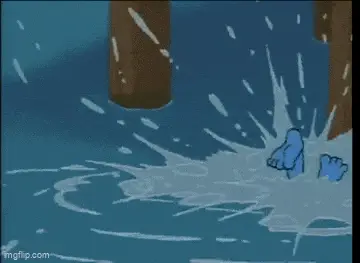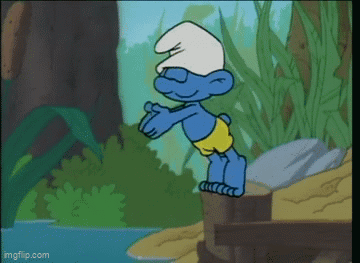 A Smurf in yellow swim trunks stands on a wooden dock, bending and straightening as if clumsy or preparing to jump.