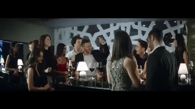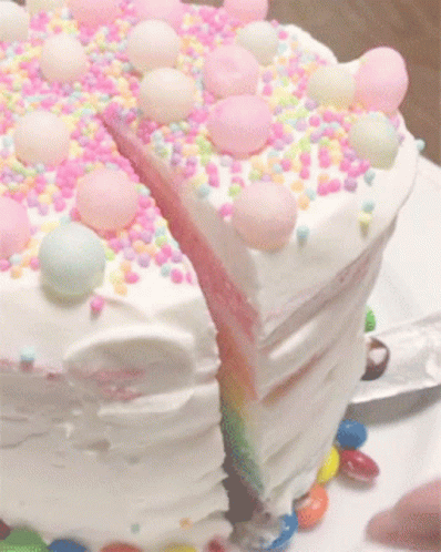 A vibrant rainbow layer cake with white frosting, colorful sprinkles, and pastel candy balls, with a slice removed.