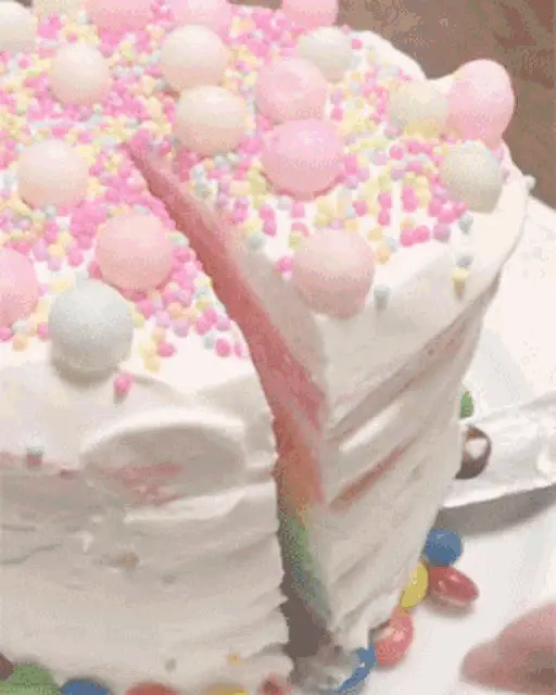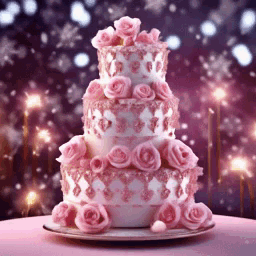 A beautiful three-tiered cake adorned with pink roses and glittery pink icing, set against a festive, sparkling background.