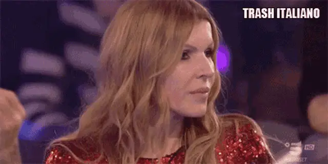 Elisabeth Savala in a red hat, covering her mouth as if coughing, wearing a fur-trimmed coat and red nail polish.
