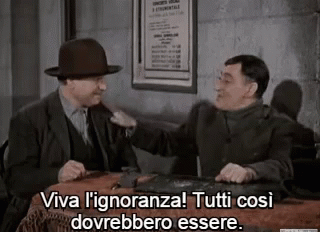 Italian comedian Totò exclaims 'Long live ignorance!' while sitting at a table with another man.
