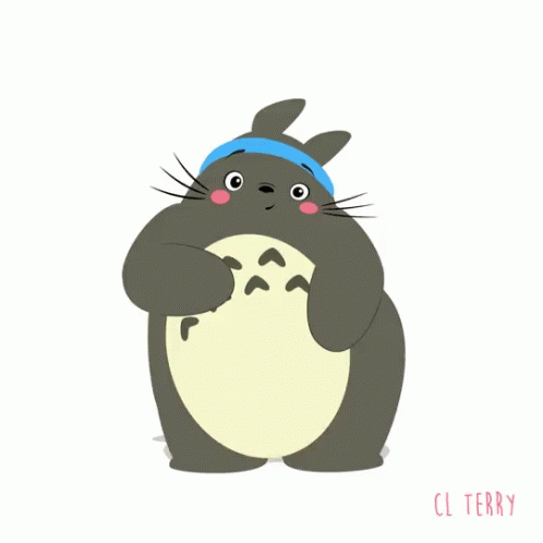 Totoro wearing a blue headband, happily dancing and exercising.