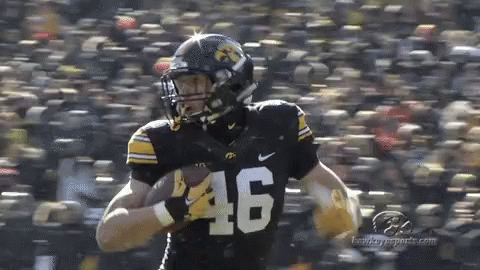 An Iowa Hawkeyes football player, number 46, runs for a touchdown on the field.