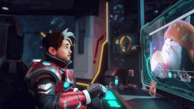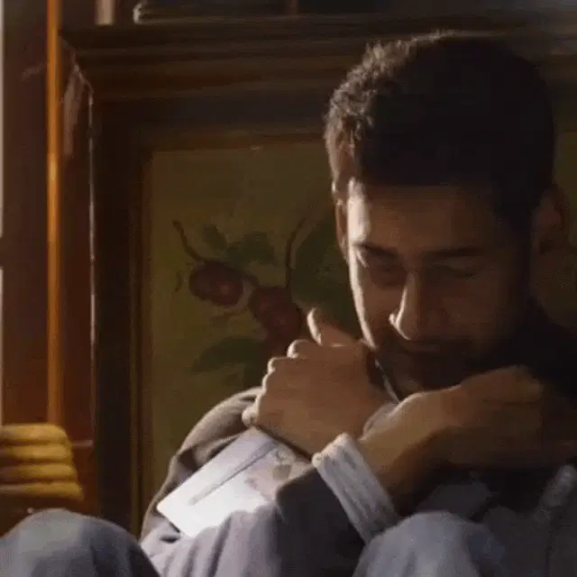 Maruv on a red couch, intimately touched on the neck by another woman with tattooed hands.