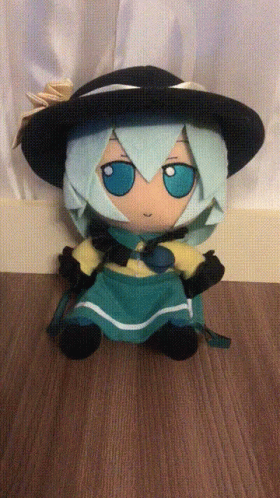 A Touhou Koishi Komeiji plushie, wearing a hat and green dress, receives a 20 Euro bill.
