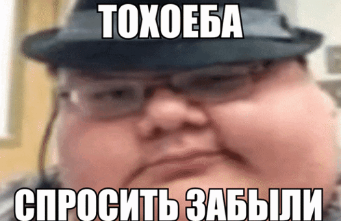 A person wearing glasses and a hat features a Russian meme on their face, stating 'TOHOEBA FORGOT TO ASK'.