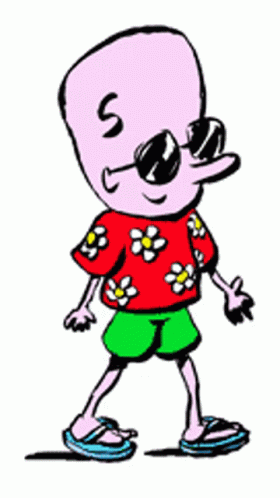 Moya Patrick, a cartoon character with sunglasses and a floral shirt, dressed as a tourist.