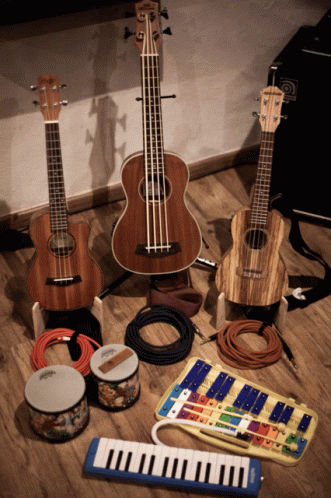 A collection of musical instruments including ukuleles, ukubass, melodica, glockenspiel, and percussion.