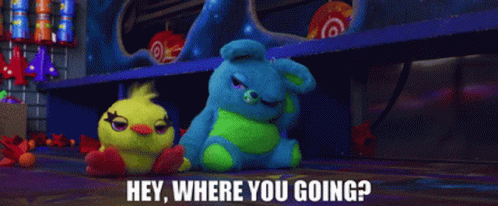 Toy Story's Ducky and Bunny are shown together with the iconic caption 'HEY, WHERE YOU GOING?'.