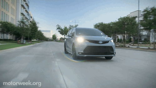 a toyota minivan is driving down a city street with motorweek.org written on the bottom