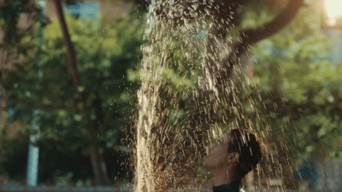 A character from Tozluyaka Yeni Dizi stands in front of a gushing fountain, getting soaked by the water.