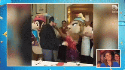 Cyril Hanouna from TPMP dancing with Disney characters Chip 'n' Dale at a table.