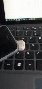 A cell phone is placed on a laptop keyboard, pressing the 'W' key, while a chat application is open on the screen.