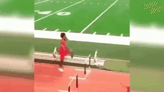 An athlete attempts to clear a hurdle on a track but fails, hitting the obstacle and falling.
