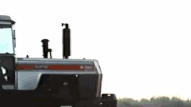 A white tractor, identified with 'WJS 319.farms', plowing a field with a red implement.